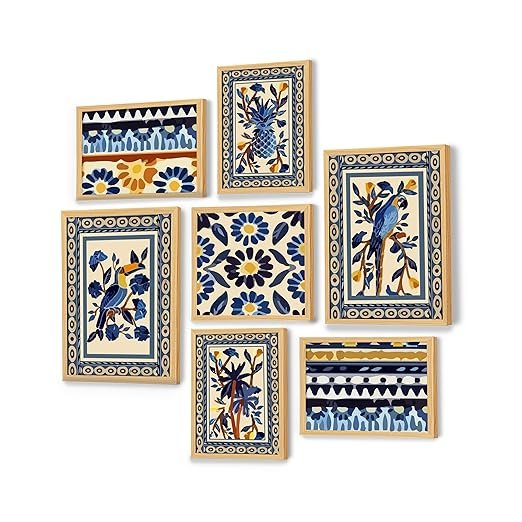 Painting Mantra Set of 7 – Indian Vintage Wall Art with Blue Birds & Floral Ritual Theme